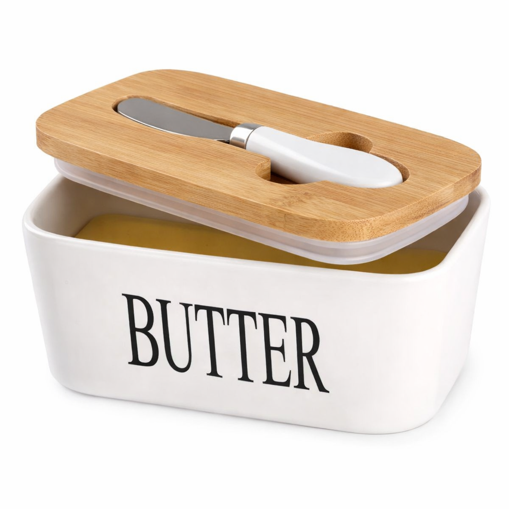 استخدمها لتخزين الزبدة بطريقة أنيقة وآمنة، كما يمكن استخدامها كمخزن للسكر، الملح، التوابل، أو حتى البسكويت والحلويات. تصميم أنيق من السيراميك (بورسلين) مع غطاء يحافظ على نضارة المحتوى.